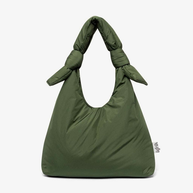Biwa Puffy Shoulder Bag Green. Quilted bag designed to be used both as a shoulder bag and as a messenger bag, thanks to its adjustable sliding knots. Its 100% recycled plastic fabric and soft quilting make it very light and pleasant to the touch. It has a large main compartment and a zipped pocket for small or essential items. Magnetic closure. Its quilted RPET fabric makes it lightweight, water resistant and vegan. Wash cold. Air dry. See our care guide for more information.