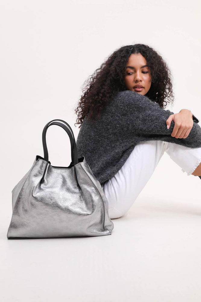 Bold, modern, and ready to turn heads—the ETHEL METAL Bag is your new power accessory. Crafted from metallic cowhide split leather, this structured tote adds just the right amount of shine to any outfit. It features both top handles and a removable, adjustable shoulder strap for styling versatility. Inside, you'll find a center zip divider, an interior zip pocket, and a dedicated phone pocket to keep everything in its place.