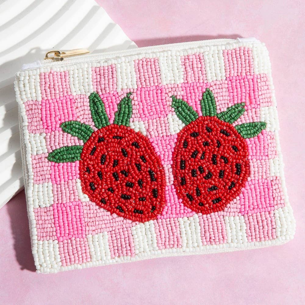 Double the strawberries, double the fun. This seed beaded coin purse features a playful double strawberry design with intricate beadwork that makes every stitch count. Compact, colorful, and completely irresistible.