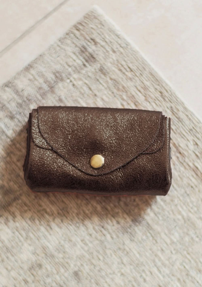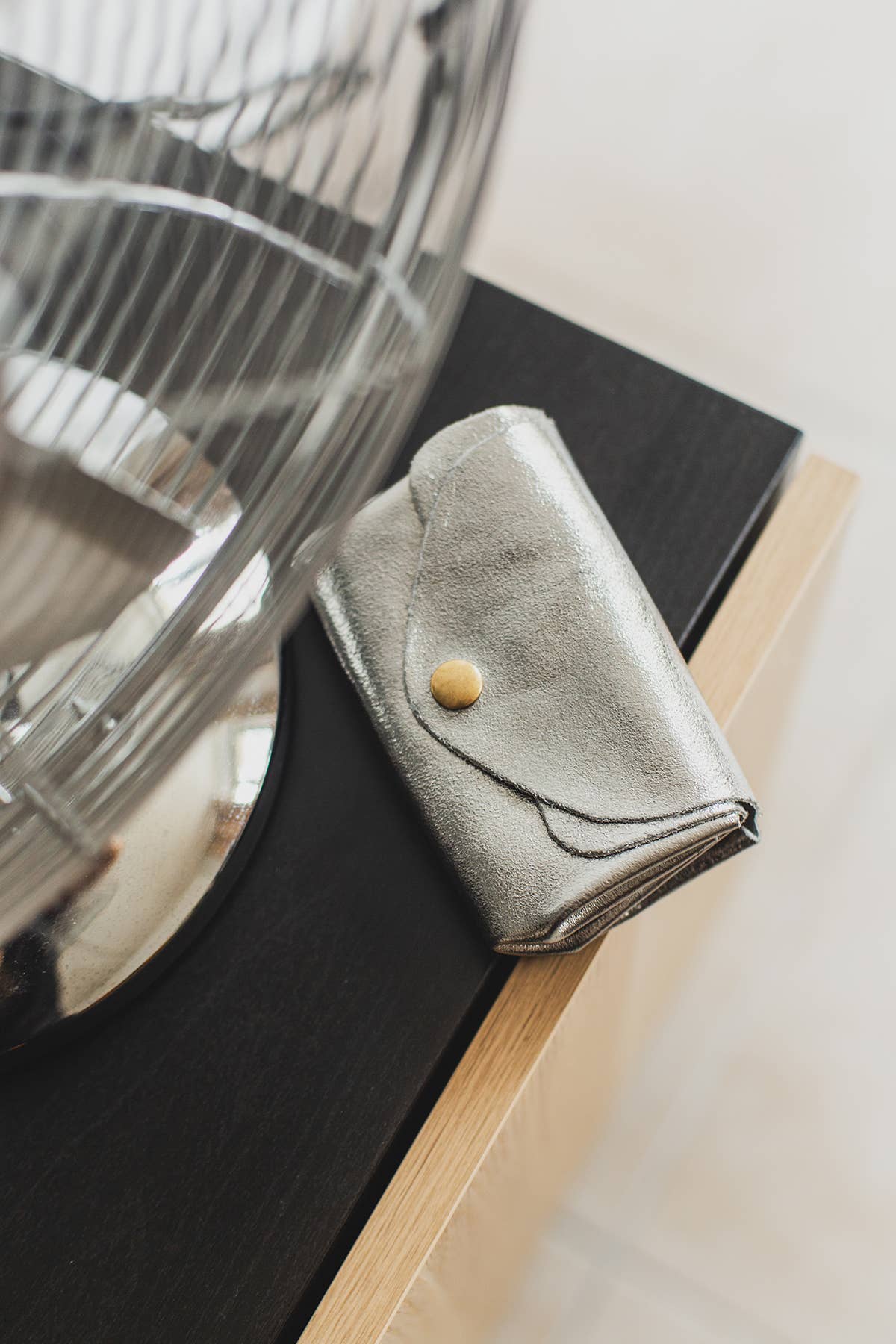 Metallic cowhide leather wallet. Main closure with snap button. Double interior compartments with interior snaps.
