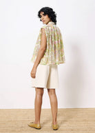 This sleeveless flowing blouse features a shirt collar and an exclusive print by FRNCH. When deciding between two sizes, it is recommended to choose the smaller size.