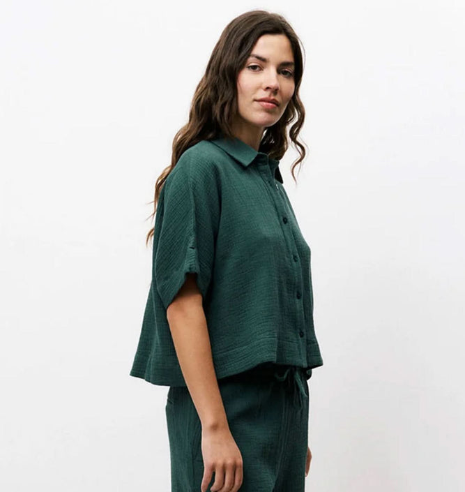 Light, effortless, and made for sunshine. This FRNCH short sleeve shirt is crafted from 100% cotton gauze in a rich evergreen shade. It features a relaxed fit, soft shirt collar, and tonal buttons for a laid-back vibe. Wear it with your go-to denim or pair it with the matching Nerline shorts for a chill, coordinated look.