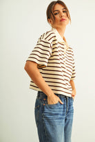 Details: Stripe Pattern · Short Sleeve · Polo Collar · Model 5'7.5" wearing size S
