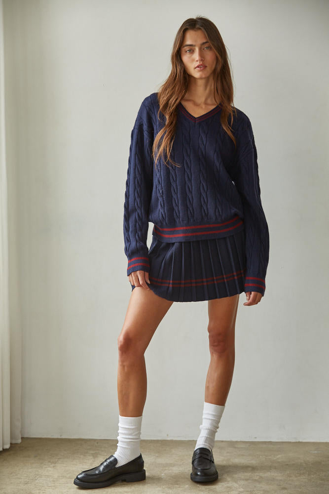 Transform your wardrobe with our Navy Sweater! This adorable piece features double red horizontal trim, adding a pop of color to any outfit. Don't forget to pair it with the matching skirt for a complete, stylish look. Upgrade your style today!