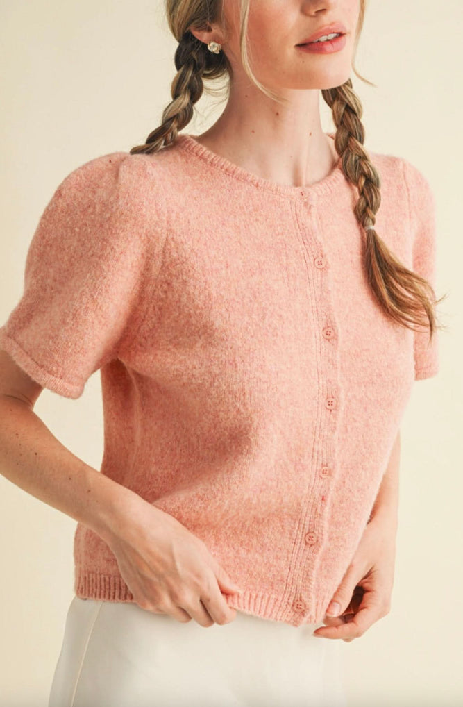 This short puff sleeve sweater cardigan was made to be layered with all your favorite ‘fits! Cozy sweater knit shapes this cute sweater that has short puff sleeves with gathered shoulders and a round neckline. Bodice features functional button down placket and ribbed knit accents the neckline, button placket, and hem.