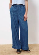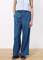 Satine Jeans by FRNCH in a mid wash denim. With elastic waistband, two front pockets, and two back patch pockets. These wide-leg jeans are made with lightweight fabric, perfect for the Spring/Summer