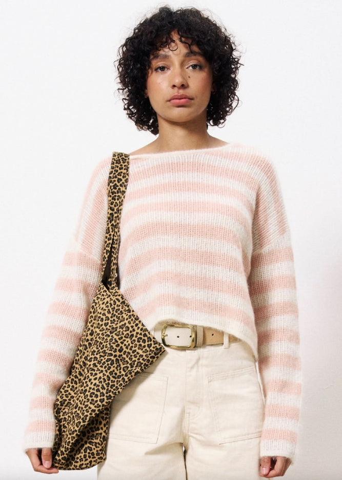 Experience a perfect balance of casual and flirty with this striped sweater, featuring long sleeves and a chic combination of pink and white.