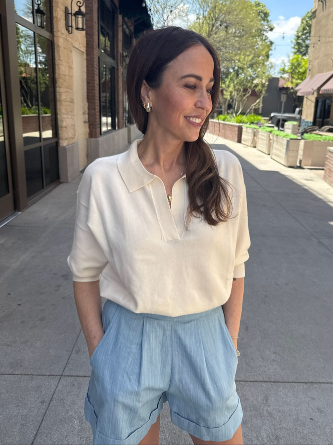 Introducing the Plume Sweater by FRNCH, a polo sweater with a playful twist! Featuring mid-length sleeves and a trendy v-neck, this cozy sweater is the perfect addition to any wardrobe.