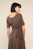Wrap heavy rib midi dress with self tie at waist. Model is 5'8" and wearing a Small. Tumble dry low or lay flat to dry. Experience effortless style and comfortable, versatile wear with our Sarah Wrap Rib Dress. Featuring a flattering self-tie waist and made with high-quality fabric, this dress is perfect for any occasion. At 5'8" tall, our model showcases the perfect fit and size in a Small. Enjoy the convenience of tumble dry low or laying flat to dry for easy care and maintenance. Elevate your wardrobe with this must-have dress.