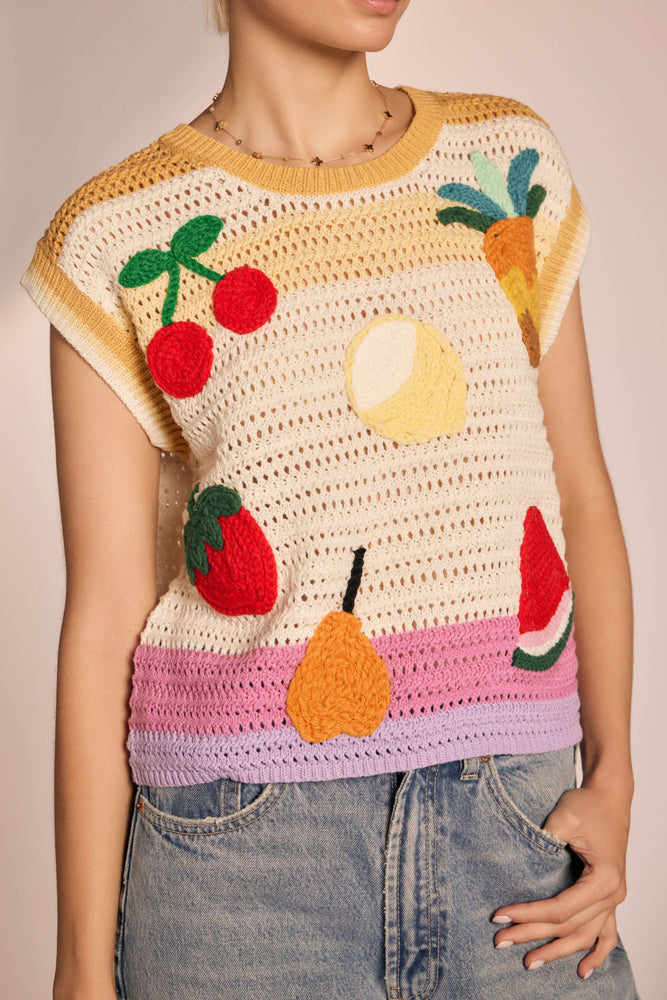 Fruit medley embroidery top in crochet knitted fabric. This sleeveless vest top features color block strip pattern, ribbed round neck, a relaxed fit, and fun crochet fruit appliqués throughout.