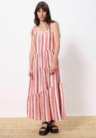 Experience effortless chic in our FRNCH Isee Maxi Dress. The elegant ruffles and wide shoulder straps are beautifully tied, creating a stunning striped design. The exquisite stitching adds a touch of sophistication to this must-have piece. Don't miss out on this exclusive dress!