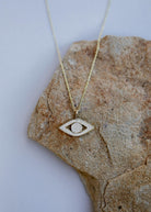 A pave encrusted evil eye guards against misfortune while bringing good luck to the wearer. We took this ancient token, strung on a thin chain, to create a piece to take this protective force out in the world each and every day. A statement piece to wear alone, or layer up two or three for a unique and mindful look! Tarnish Free. 16-18 inch chain. 18k gold plated.