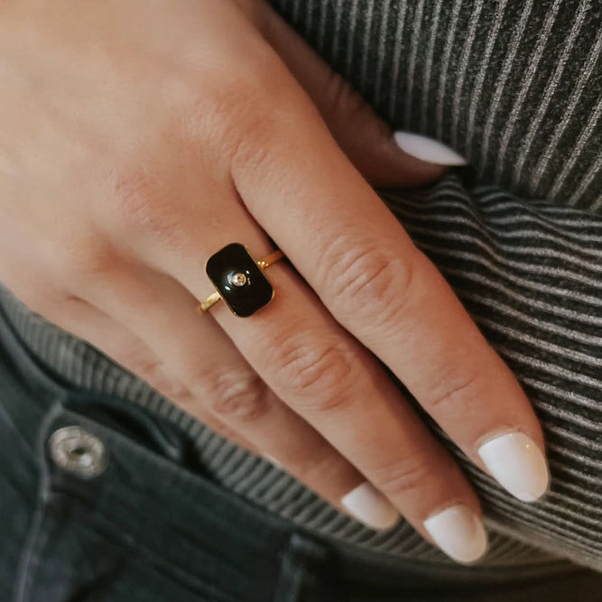 Elevate your jewelry collection with the exquisite Ryker Crystal Black Ring, a stunning piece from our women-owned extended size fashion store. Crafted with meticulous attention to detail, this glossy black ring features a sleek rectangular shape adorned with a single crystal set in the center, exuding timeless elegance and sophistication. Whether worn as a daily accessory or for special occasions, this ring is sure to turn heads and add a touch of sparkle to any ensemble. Made from high-quality 18K gold-plated stainless steel, it boasts durability and style that will last a lifetime.