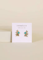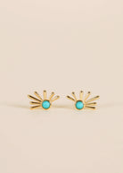 A turquoise opal stud set inside an organically shaped sun ray. Tarnish Free - Long lasting protective coating safeguarding your jewelry from sweat, water, and more. Sterling Silver Posts – 18K gold plating over brass Hypoallergenic – Lead Free Turquoise Stone Width 10mm