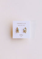 A white opal stud set inside an organically shaped sun ray. Tarnish Free - Long lasting protective coating safeguarding your jewelry from sweat, water, and more. Sterling Silver Posts – 18K gold plating over brass Hypoallergenic – Lead Free Lab-grown White Opal Stone Width 10mm