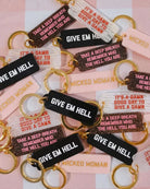 Add a touch of personality to your keys with our Small Keytag Keychain, a stylish accessory that speaks volumes. Crafted with care, this keychain features makes a bold statement wherever you go. With dimensions of 2" x 0.75", it's compact enough to fit comfortably in your pocket or purse, yet eye-catching enough to stand out. The keychain is equipped with a 1" gold keyring, ensuring your keys stay secure while adding a touch of elegance to your everyday essentials.