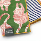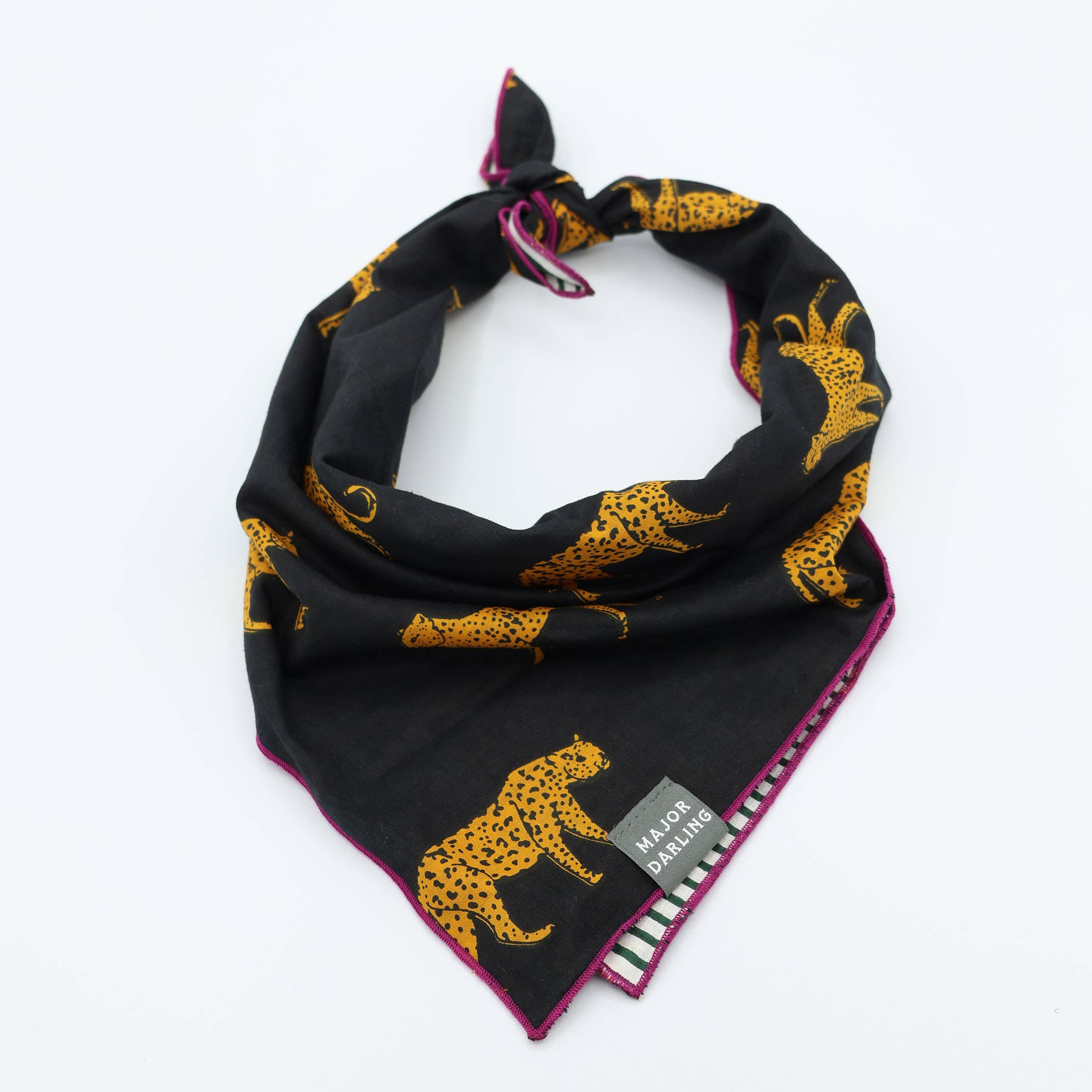 Two looks in one! Reversible bandana made with hand block printed fabric and a contrast rolled hem. Pre-washed and super soft! Roughly 21" square.
