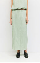 The Dunn Skirt is a flowing maxi skirt crafted from lightweight, textured fabric with crisp broomstick pleats for added movement. Finished with a comfortable waist band, it pairs effortlessly with The Dunn Top
