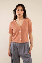 Experience unmatched comfort and style with the Jacquard heavy rib short sleeve button down top. Made with ultra-soft fabric and featuring elegant shell buttons, this top is perfect for any occasion. Elevate your wardrobe with this timeless piece that will surely become a staple in your closet.