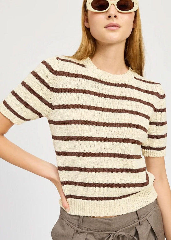 The most adorable short sleeve sweater featuring brown and cream stripes. The trendy color of the season is mocha moose and will effortlessly complement any outfit in your wardrobe. Dress it up with jeans and loafers or dress it down with a skirt and ballet flats.