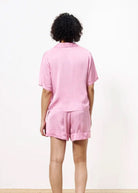 The FRNCH Chelly blouse in a gorgeous drapey satin fabric brings colour and vibrancy to your wardrobe. In a boxy shape with short sleeves, collar revere, flattering v neck and contrast ivory buttons. Perfect for pairing back with light bottoms for a spring or summery style. 100% Viscose