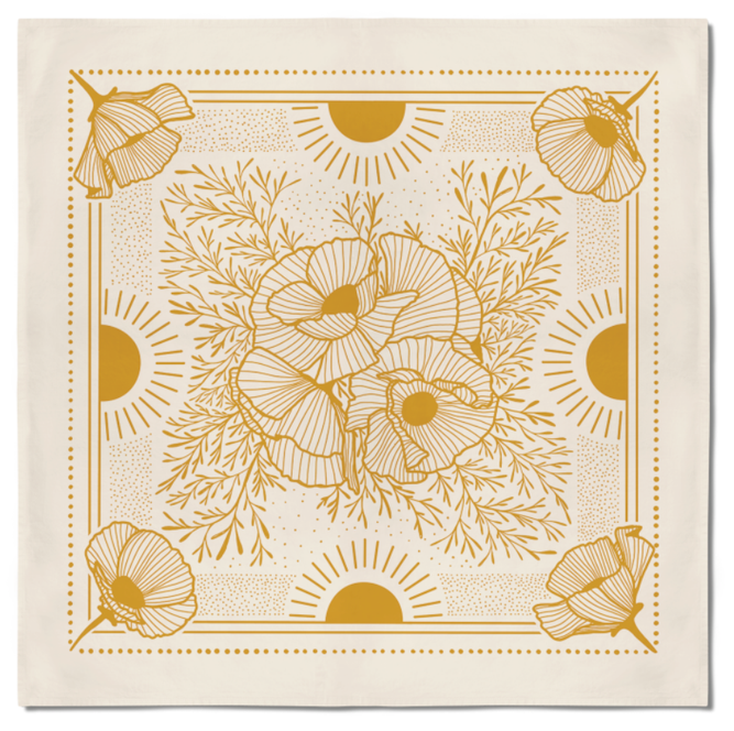 This 22” cotton bandana features a design of poppies and suns. The illustration is silk screened with water-based ink in golden orange on a natural, cream colored bandana.