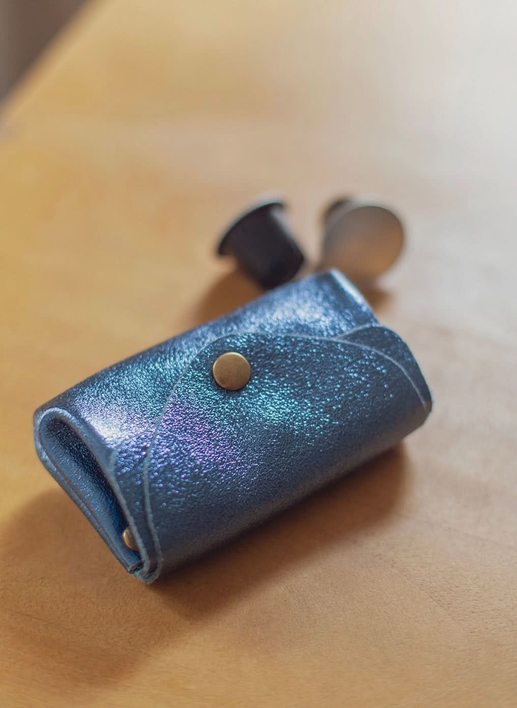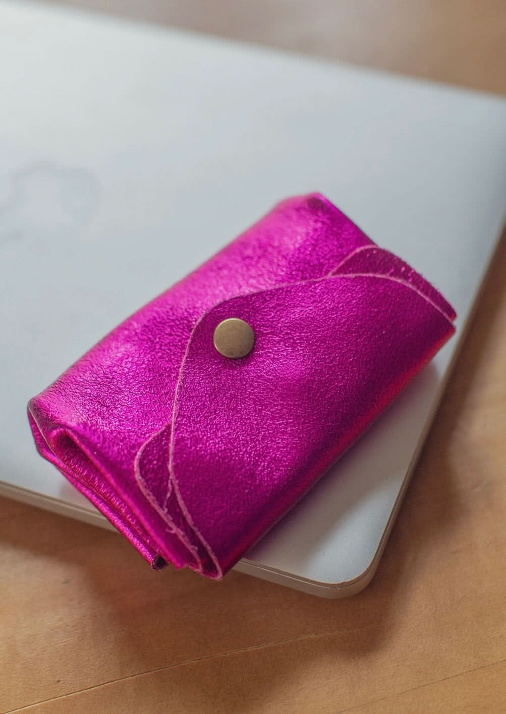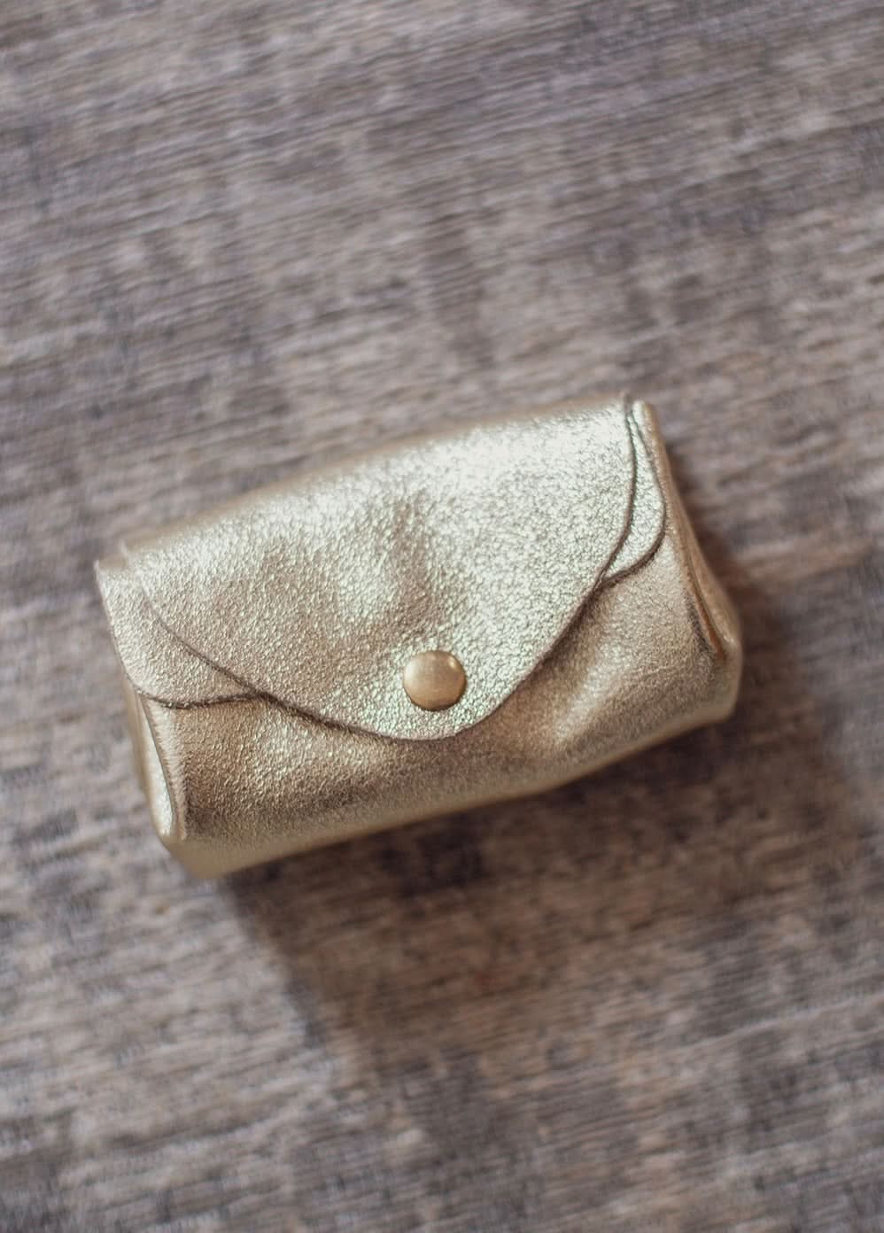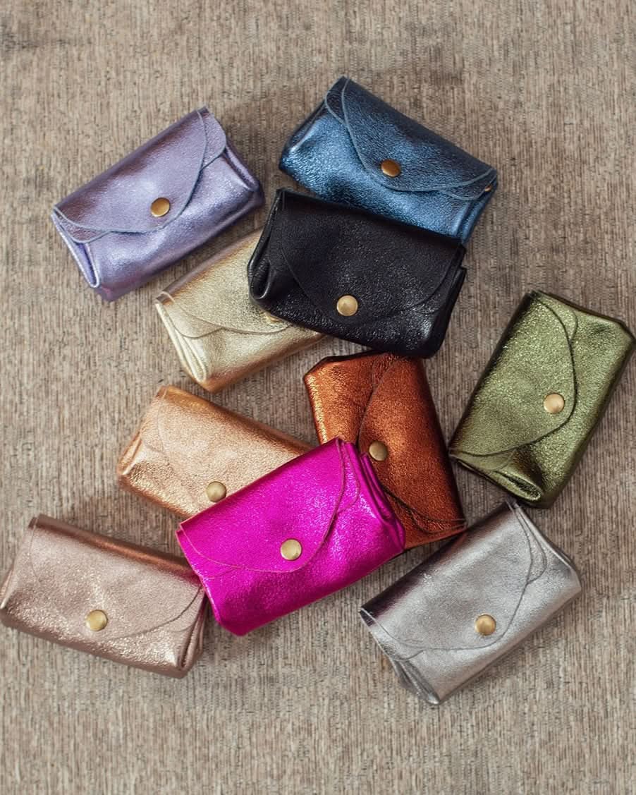 Metallic cowhide leather wallet. Main closure with snap button. Double interior compartments with interior snaps.