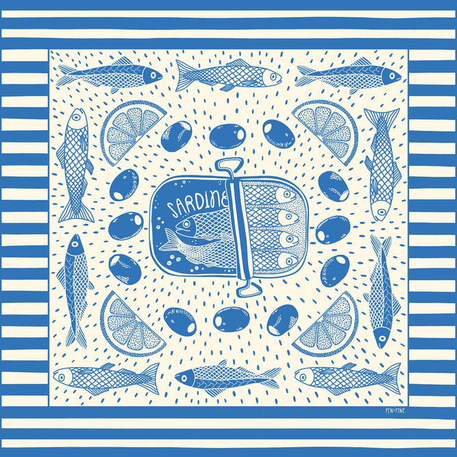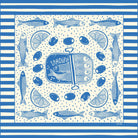 This 22” cotton bandana features illustrations inspired by a European summer picnic: sardines, lemon slices, and olives, surrounded by a striped border. The bright blue ink against the natural colored bandana will make this your new favorite accessory.