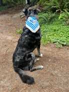 The design is silk screened with water-based ink in blue on a natural colored bandana. The ink becomes soft and pliable after just one wash, and will continue to soften overtime. These bandanas are printed in California using eco-friendly methods.