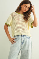Lightweight Knit Fabric · Scalloped Edge Detail · Short Sleeves · Soft and Breathable · Relaxed Fit · Cream and Sage Tones · Everyday Styling Essential · Model Wearing Size Small ·