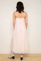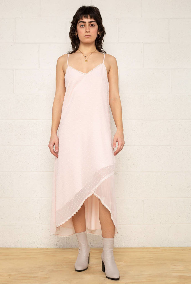 Swiss dot chiffon slip with asymmetric hem. Tumble dry low or lay flat to dry Model is 5'8" and wearing a Small Import